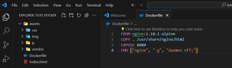 Además, necesitarás un archivo llamado Dockerfile para configurar nginx. Visto desde Visual Studio Code, tendrá la siguiente estructura: